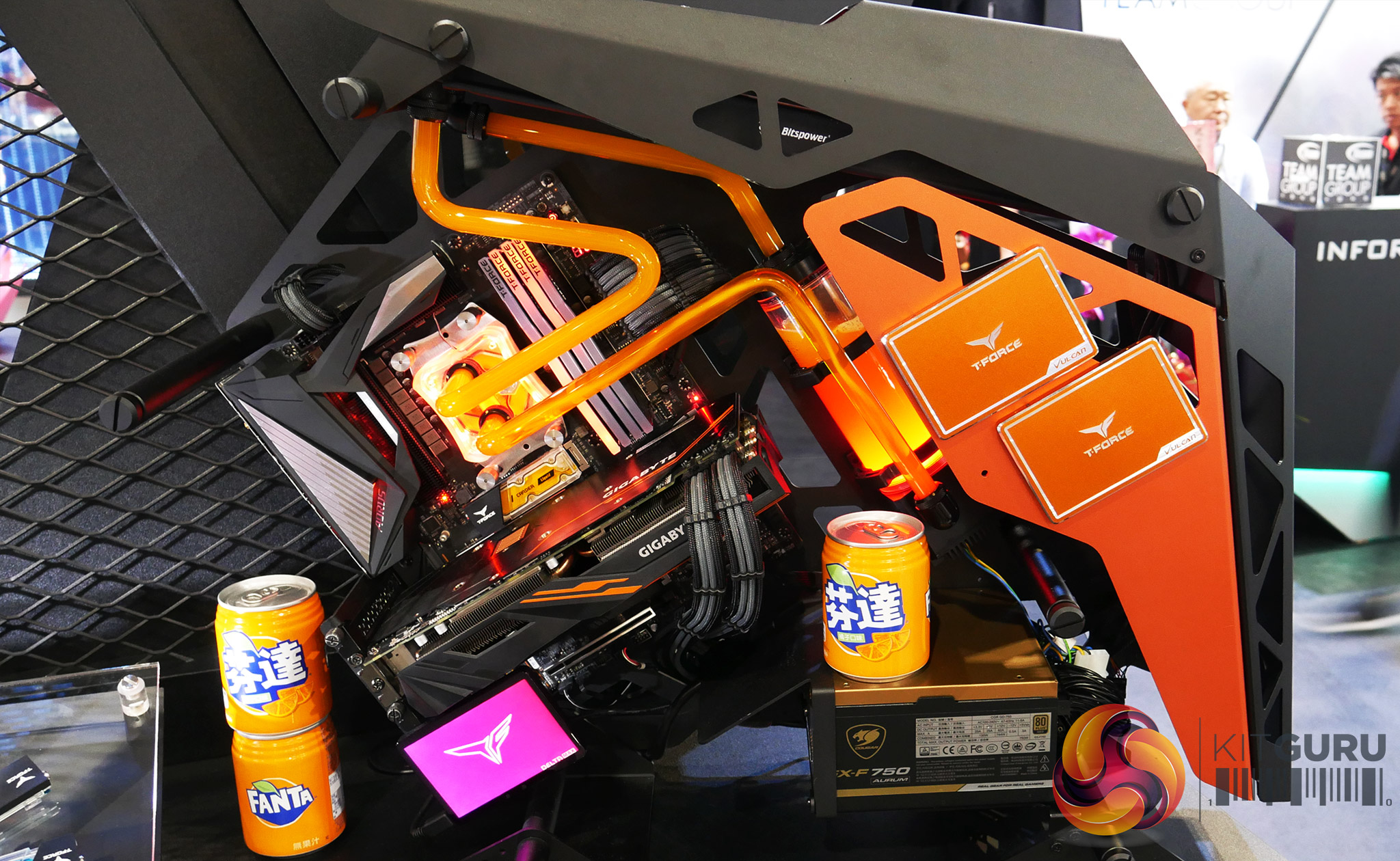 Team Group's T-FORCE brand is the main focus at Computex this year. The first thing we see walking into the booth is this high-end liquid cooled build with T-FORCE SSDs and RGB RAM as the centre of attention. This is primarily used to show off the new TFORCE M.2 SSDs, which come with heat shields filled with liquid coolant, although you won't be able to hook it up to a full custom water loop.