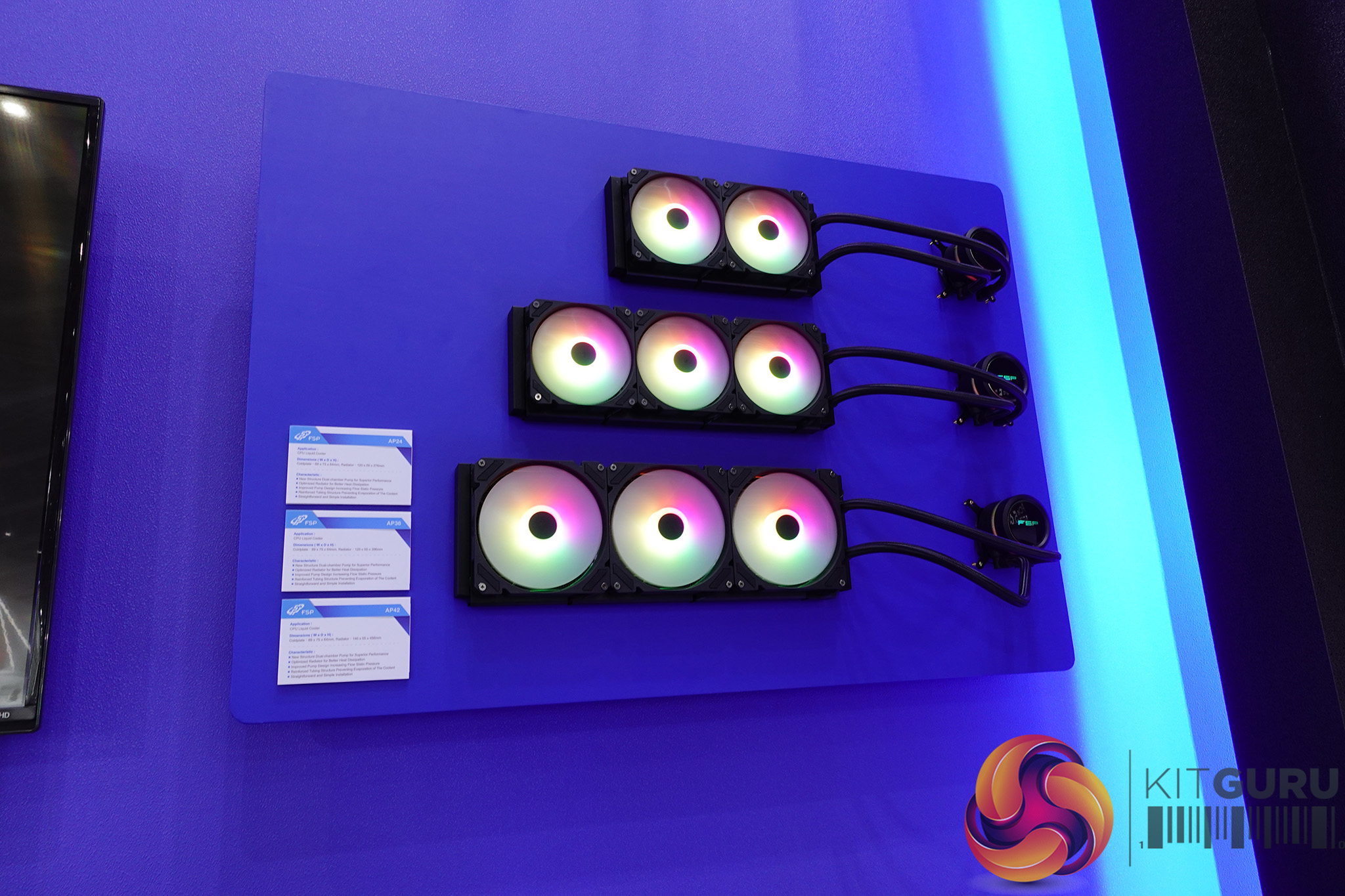 FSP has a new high-end air cooler in the works, the MX09. It is a dual-tower heatsink with a 120mm fan on the front and a 140mm fan in the centre between the two heatsinks. It has six heatpipes to draw heat away from the CPU and a spring-loaded installation method and convenient fan placement should make it easy to install. There are also three AIO liquid coolers on the way with RGB fans and an RGB-lit logo on the CPU pump, available in 240mm, 360mm and 420mm sizes. They use a dual-chamber pump design and handy cable covers to keep fan cables hidden.