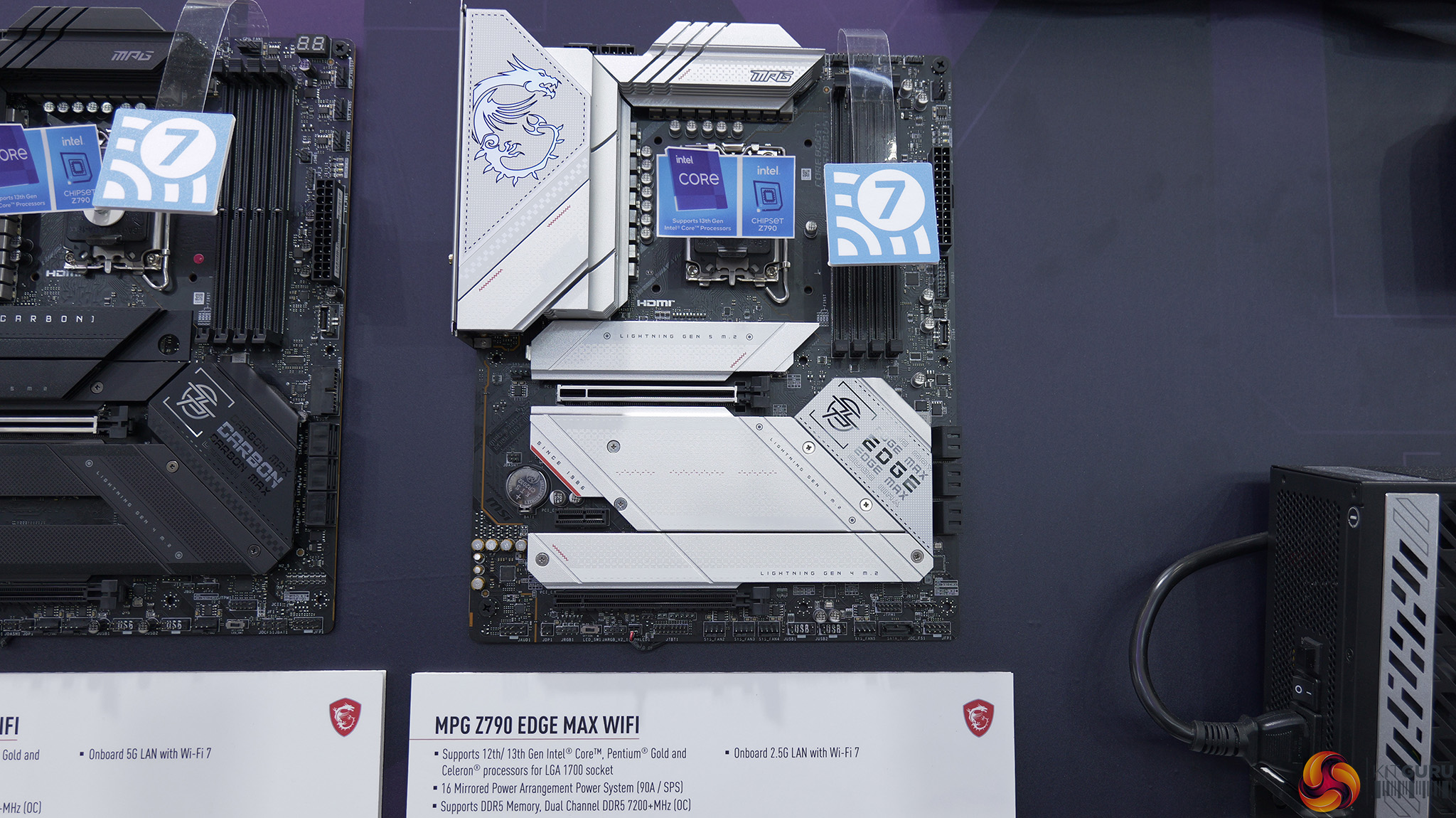 On the motherboard front, MSI had a few interesting boards on show – the new Intel Z790 MAX and Z790 Edge Max WiFi motherboards (coming Q3), and the new Project Zero back-connect B650M motherboard. The first is a new flagship motherboard sporting a brand new Wi-Fi 7 solution, while the Edge version is a slightly cheaper model with the same WiFi 7 upgrade. Meanwhile, the Project Zero board is a new type of motherboard that moves all fan connectors and power cables to the back of the board, allowing for zero cables at the front of the case, resulting in a much cleaner build. This idea has been explored before by several motherboard makers, with MSI now being the latest.