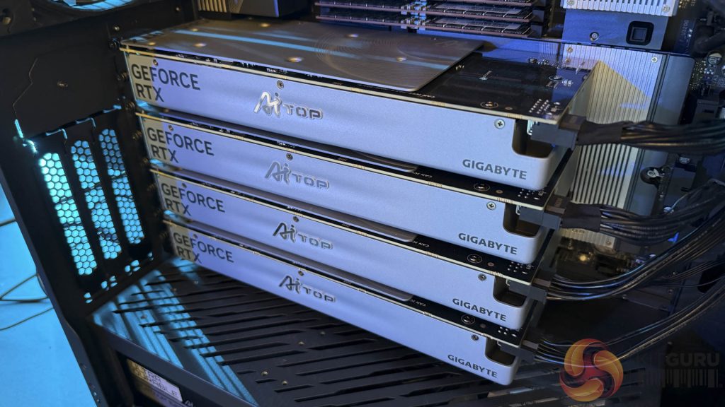 When it comes to the RTX 4070 Ti Super Ai TOP cards being used, the Ai label relates primarily to the improved cooling set up, according to Gigabyte. There is a Turbo fan system made from Ultra Durable materials and a double ball-bearing structure that means you can run larger loads, at higher speeds, for longer. The fact that the increased cooling capacity still allows for a 2-slot design, means that you can stack four of these on one of Gigabyte’s latest boards.