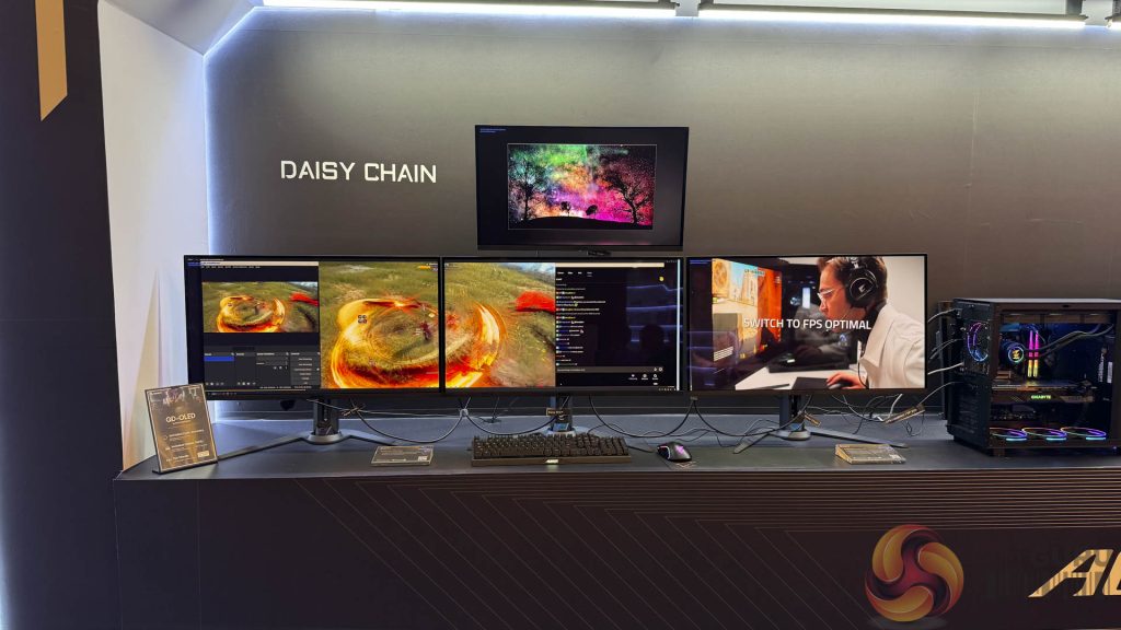 The display section included the “World’s First DP2.1 UHBR20 OLED Gaming Monitor”, first seen at CES, alongside the new Aorus F032U2P monitor. This is a QD OLED with 240Hz refresh and a 0.03ms response time. The DP2.1 UHB20 means 70Gbps bandwidth and there is a ‘Tactical Switch’ that lets you quickly change resolution and display size. The connections available allow users to daisy-chain up to four screens with 4K resolution – while still maintaining a 120Hz refresh. It has been VESA certified for ClearMR 13000 and DisplayHDR 400 for ‘True Black’.
