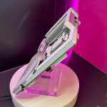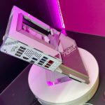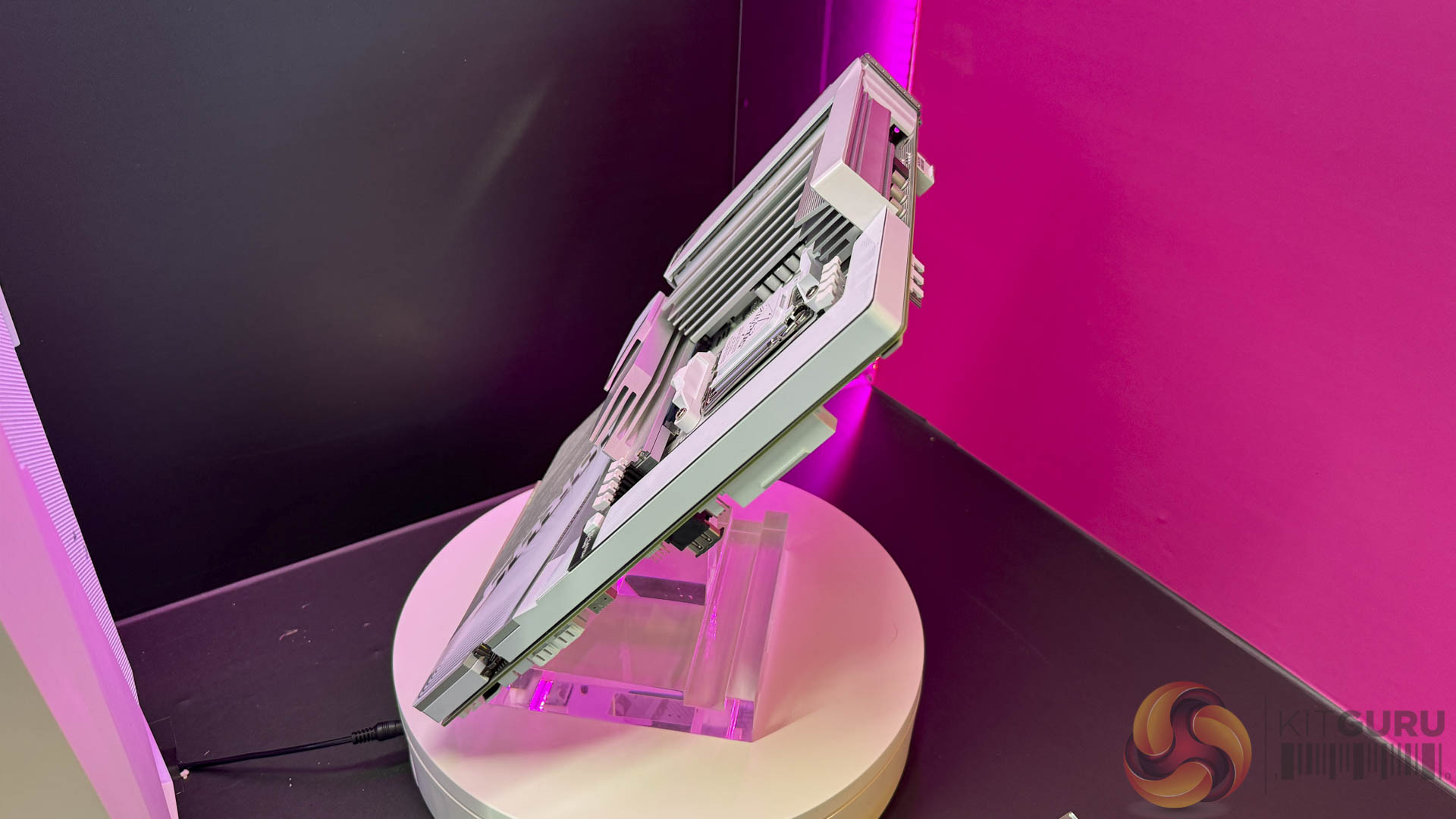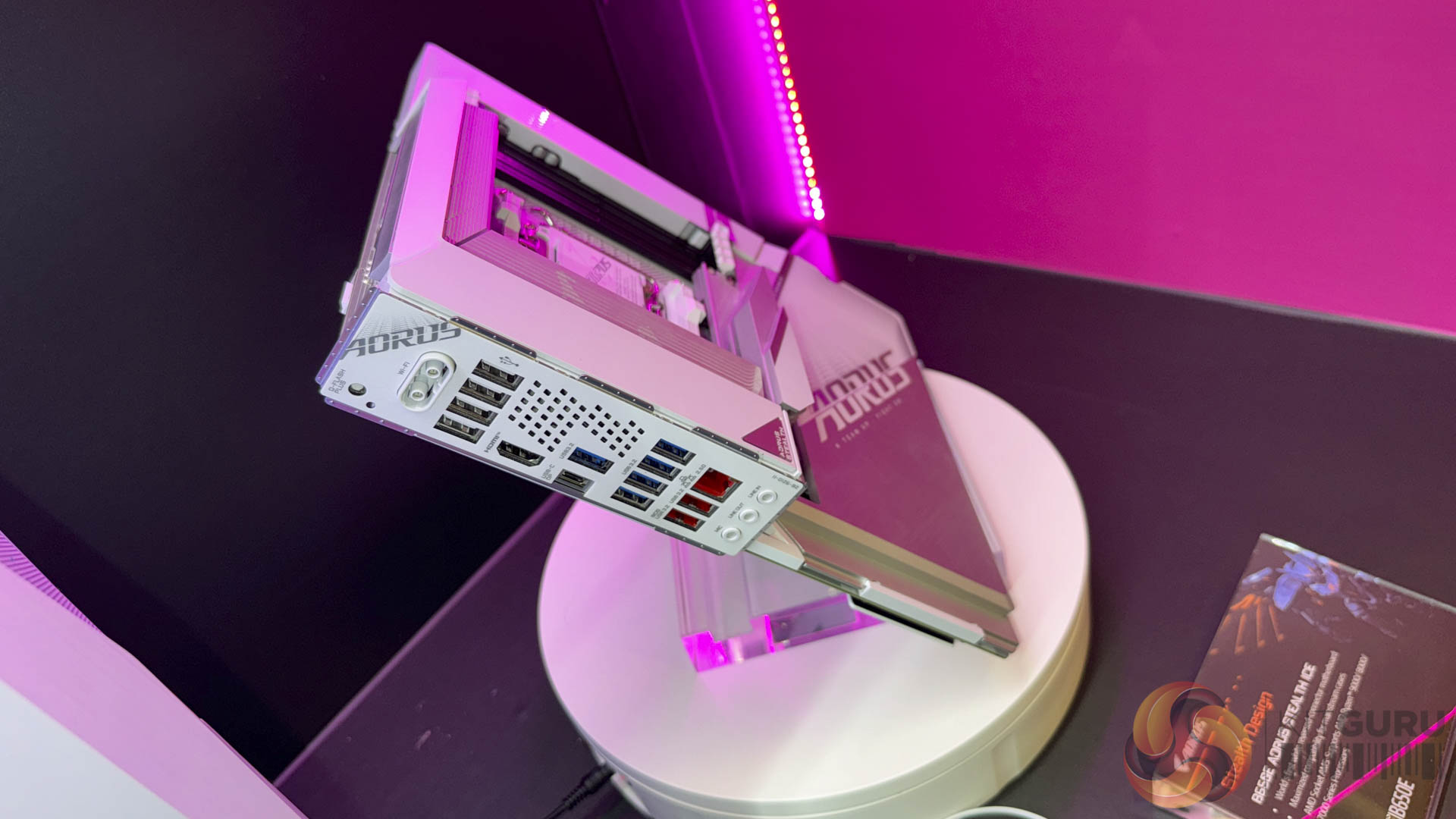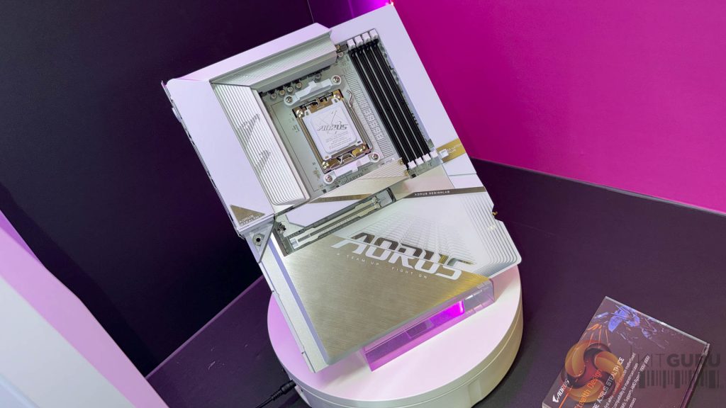 Next to the new monitors was the start of the motherboard presentation area. The B650E Aorus Stealth Ice is, according to our Gigabyte handlers, the world’s first white motherboard with the connectors on the back. This will take Ryzen 9000 processors – as well as 7000 and 8000 series. It’s a pretty stylish design with lots of connectivity on the back.