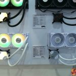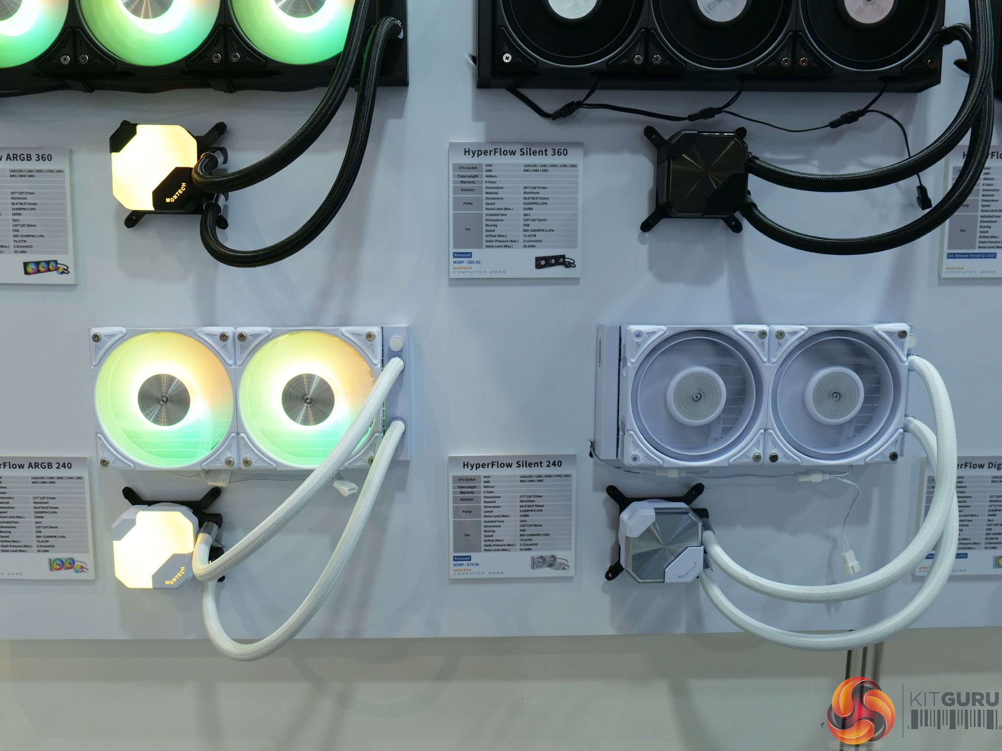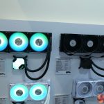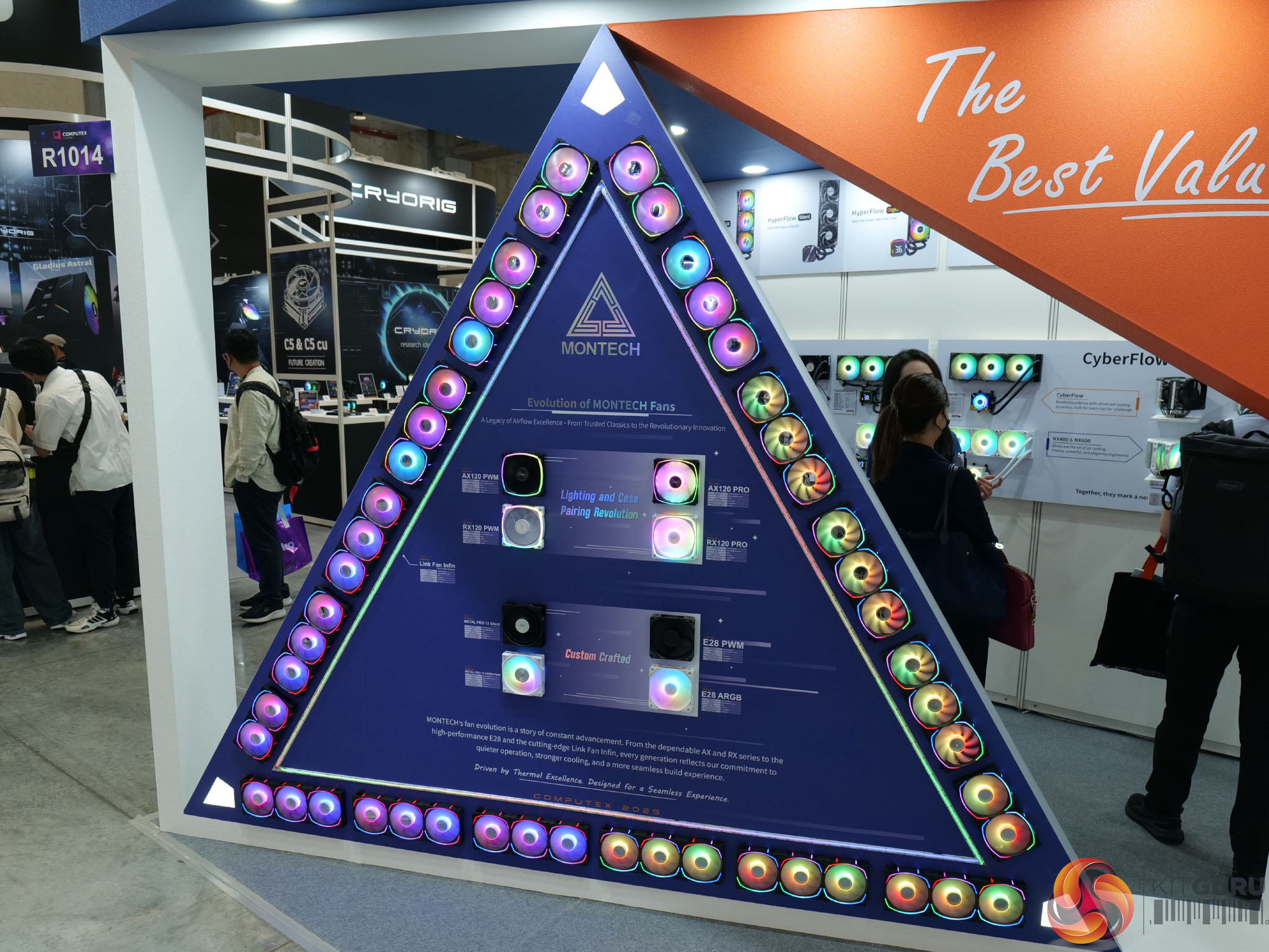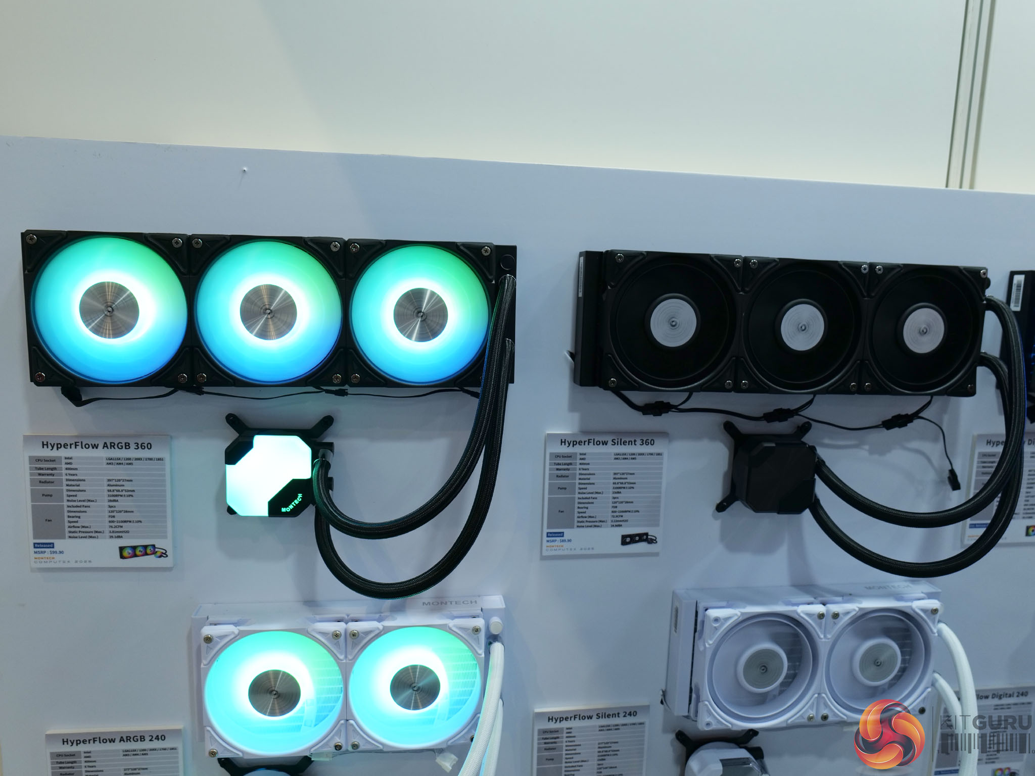 After walking past the pyramid of fans, Leo makes his way to the new Montech Hyperflow AIO liquid coolers. These coolers are available in 240mm and 360mm radiator sizes. Joining the line-up in Q3 is the brand new Hyperflow Digital 360, which has an embedded display over the pump block. It is a trend we've seen a lot of this year, but Montech has included thicker 28mm fans, rather than the standard 25mm for improved performance. Later in the year, the Cyberflow 360 will also hit the market, which Montech claims will improve cooling by as much as 20 percent compared to some current models.