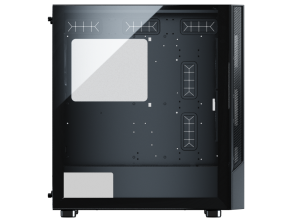 As far as cooling goes, there are three fans pre-installed in the front and back of the case, with room for up to eight 120mm fans total in the case, as well as liquid cooling radiators. For storage, you'll find three 3.5″ HDD and 2.5″ SSD bays.