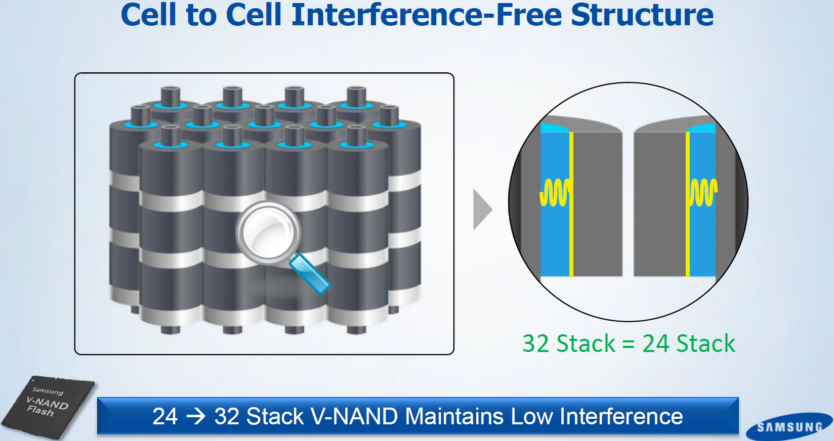 Samsung claims that its 3D V-NAND exhibits at least two times the endurance and writes data (tPROG, program time) at least twice as fast as multi-level-cell (MLC) type planar NAND flash memory made using one of the latest manufacturing processes. Besides, 3D V-NAND is also more energy-efficient than planar NAND memory: it consumes around 40 per cent less of power.