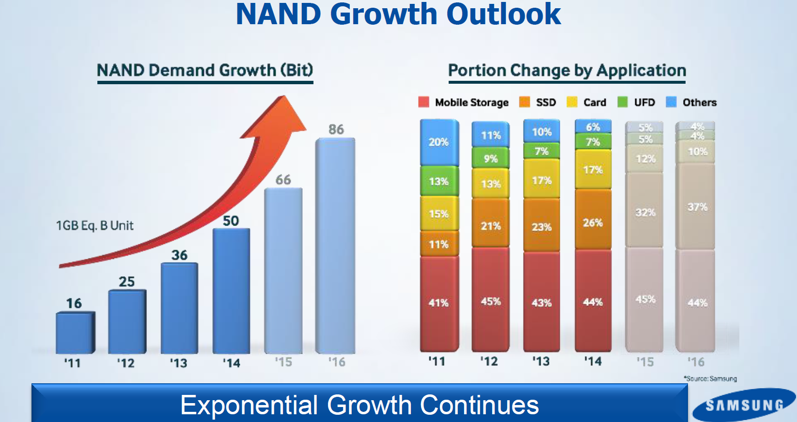 Perhaps, what is even more important, 3D NAND allows to rapidly increase capacities of NAND flash chips and solid-state drives, something the industry needs badly. According to predictions by Samsung, total available market for NAND flash memory will grow to 66 billion 1GB equivalent memory chips this year, up from 50 billion of 1GB equivalent memory devices. As a result, it is getting crucial to increase density of NAND flash memory ICs [integrated circuits], something, which 3D NAND technology allows to do relatively easily.