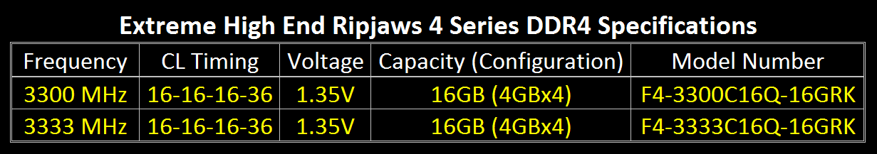 The new “extreme high-end” Ripjaws 4-series DDR4 memory modules come in 16GB quad-channel kits. G.Skill's latest DDR4 memory solutions are rated to run at 3300MHz or 3333MHz with CL16 16-16-36 latency settings at 1.35V voltage. G.Skill claims that the modules are fully validated on the Asus Rampage V Extreme X99 motherboard. The Ripjaws 4 memory modules with clock-rates over 2400MHz support Intel XMP 2.0 for automatic and trouble-free tuning.