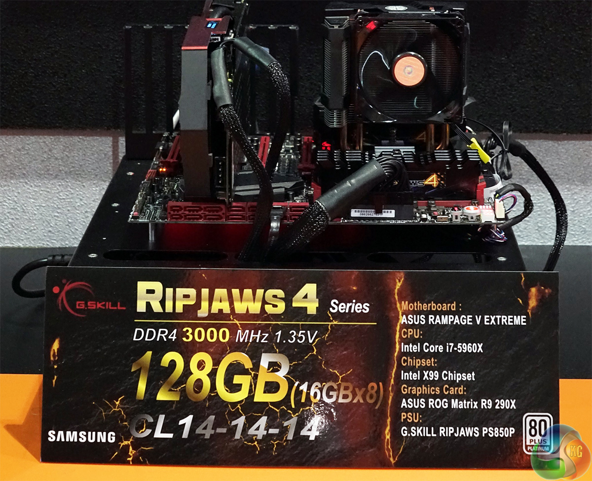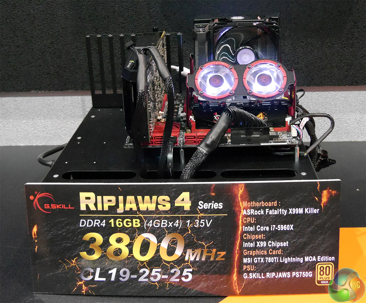 G.Skill has been offering DDR4 memory kits with rather extreme clock-rates for about a year now. At Computex, the company revealed its new Ripjaws 4 16GB (4*4GB) sets of memory modules rated to run at 3800MHz with 1.35V voltage in quad-channel mode. Precise specifications of the memory solutions are still unclear, but the company is already showcasing them in action at Computex, reports Leo Waldock, a KitGuru editor, from Taipei, Taiwan.