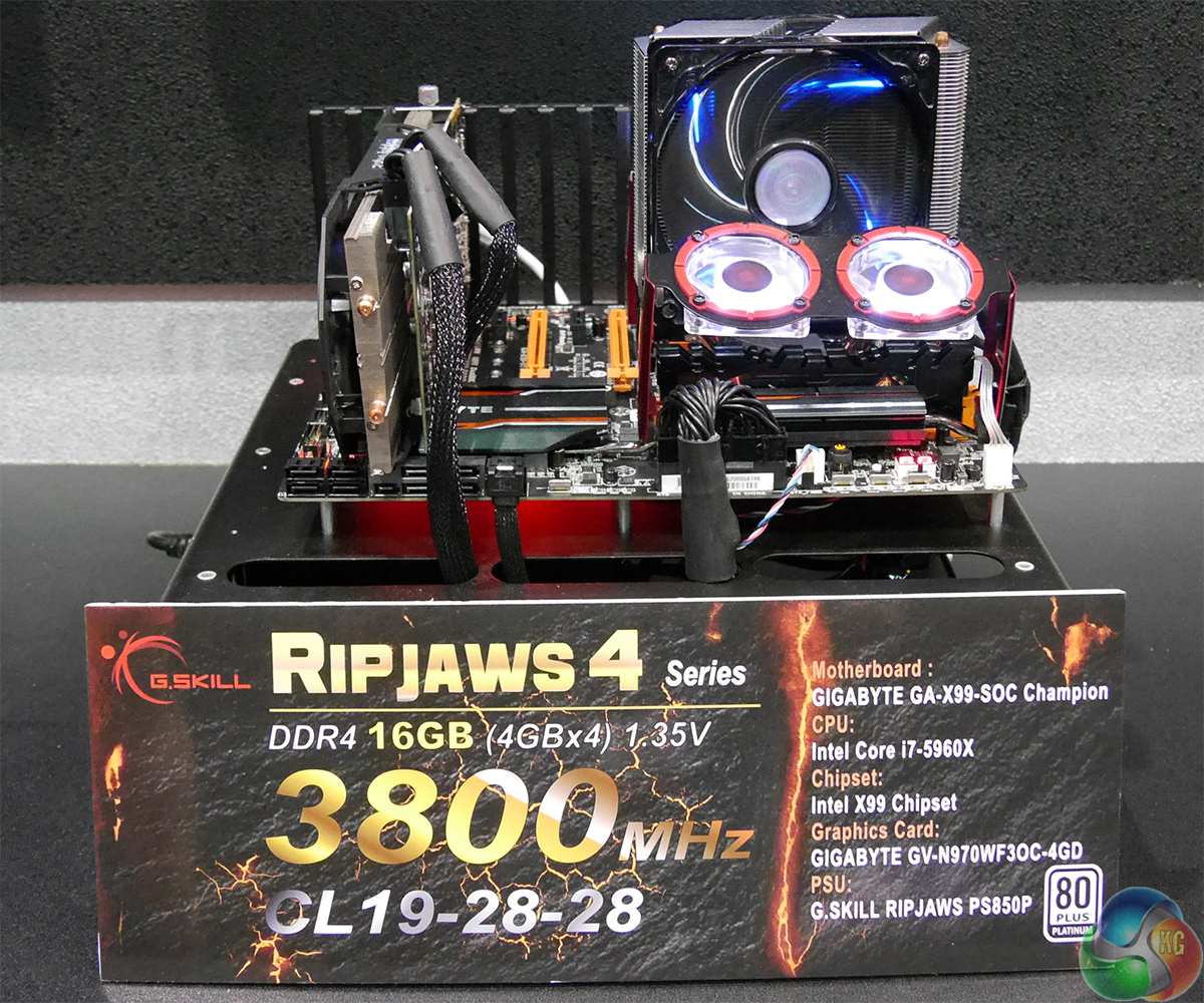 The two DDR4-3800 live demo systems are based on Intel’s Core i7-5960X processors as well as Gigabyte GA-X99-SOC-Champion and Asrock Fatal1ty X99M Killer motherboards. The Gigabyte motherboard can run G.Skill’s new DDR4 memory at 3.80GHz with CL19 28-28 timings, whereas the Asrock platform can run similar DDR4 modules at 3.80GHz with CL19 25-25 latency settings. The quad-channel kits require active cooling to work at extreme frequencies.