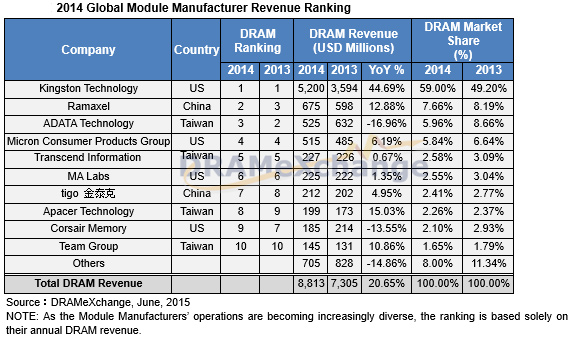- Kingston retained its No. 1 position with 59 per cent revenue share, it took full advantage of increasing contract trades and stable prices, according to DRAMeXchange. Kingston managed to increase sales of DRAM modules by rather whopping 44.69 per cent last year.