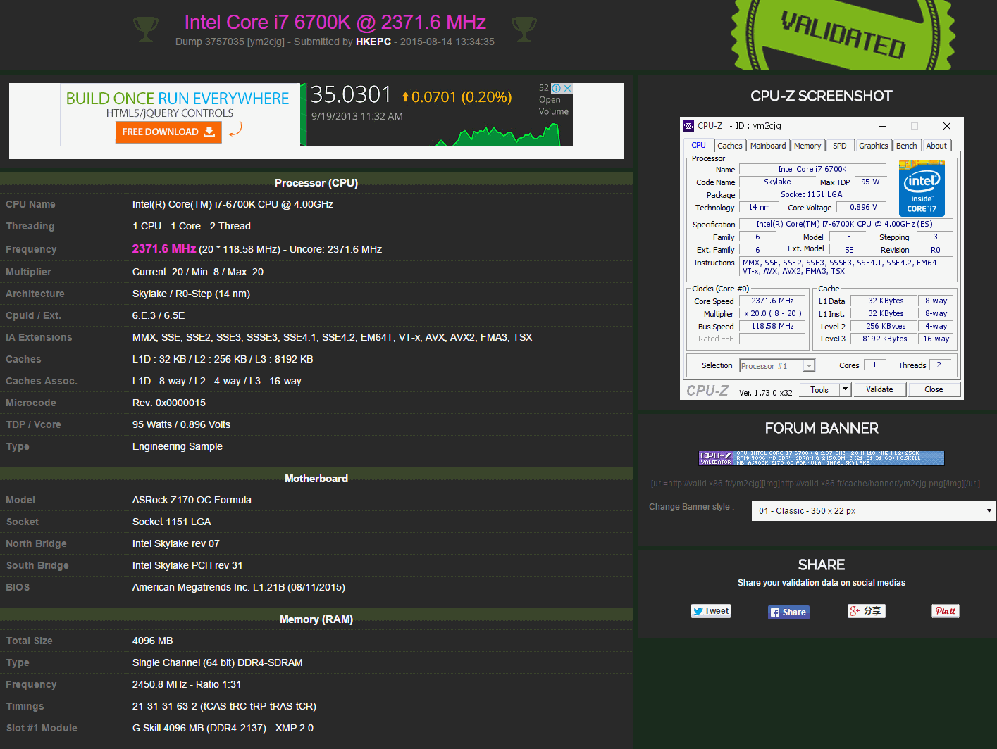 To set the record, the overclocker used an engineering sample of Intel Core i7-6700K “Skylake” processor downclocked to 2371.6MHz with three cores disabled. He also used an Asrock Z170 OC Formula mainboard as well as a 1300W power supply unit. The microprocessor and the module were cooled-down using liquid nitrogen.