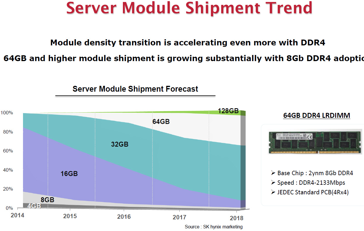 SK Hynix plans to start mass production of 16GB, 32GB and 64 GB DDR4 memory modules for servers in the second quarter of 2015, just like it planned last year. However, 128GB DDR4 memory solutions rated to run at 2.13GHz or 2.40GHz will become available only in Q4 2015, according to a document seen by KitGuru.