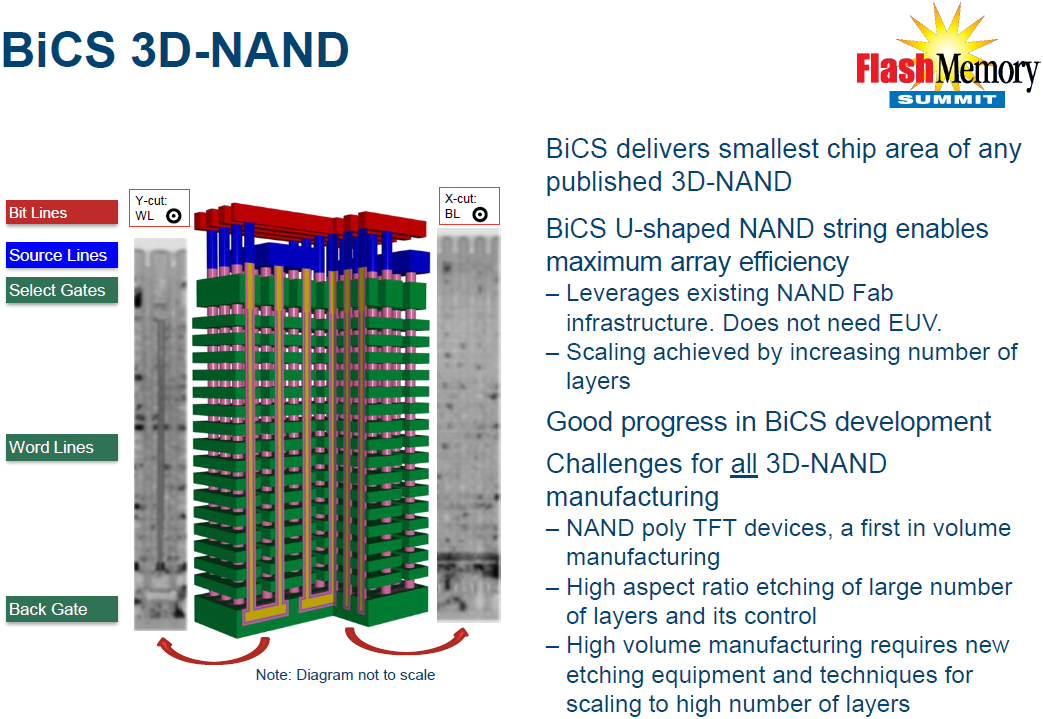 Three-dimensional NAND flash features higher performance, longer endurance and lower per bit costs (once yields reach commercially viable levels) compared to traditional planar NAND flash memory used today. Numerous peculiarities of Toshiba’s/SanDisk’s BiCS 3D NAND architecture, such as U-shaped NAND string, enable maximum array efficiency and minimize actual chip sizes compared to competing 3D NAND architectures.