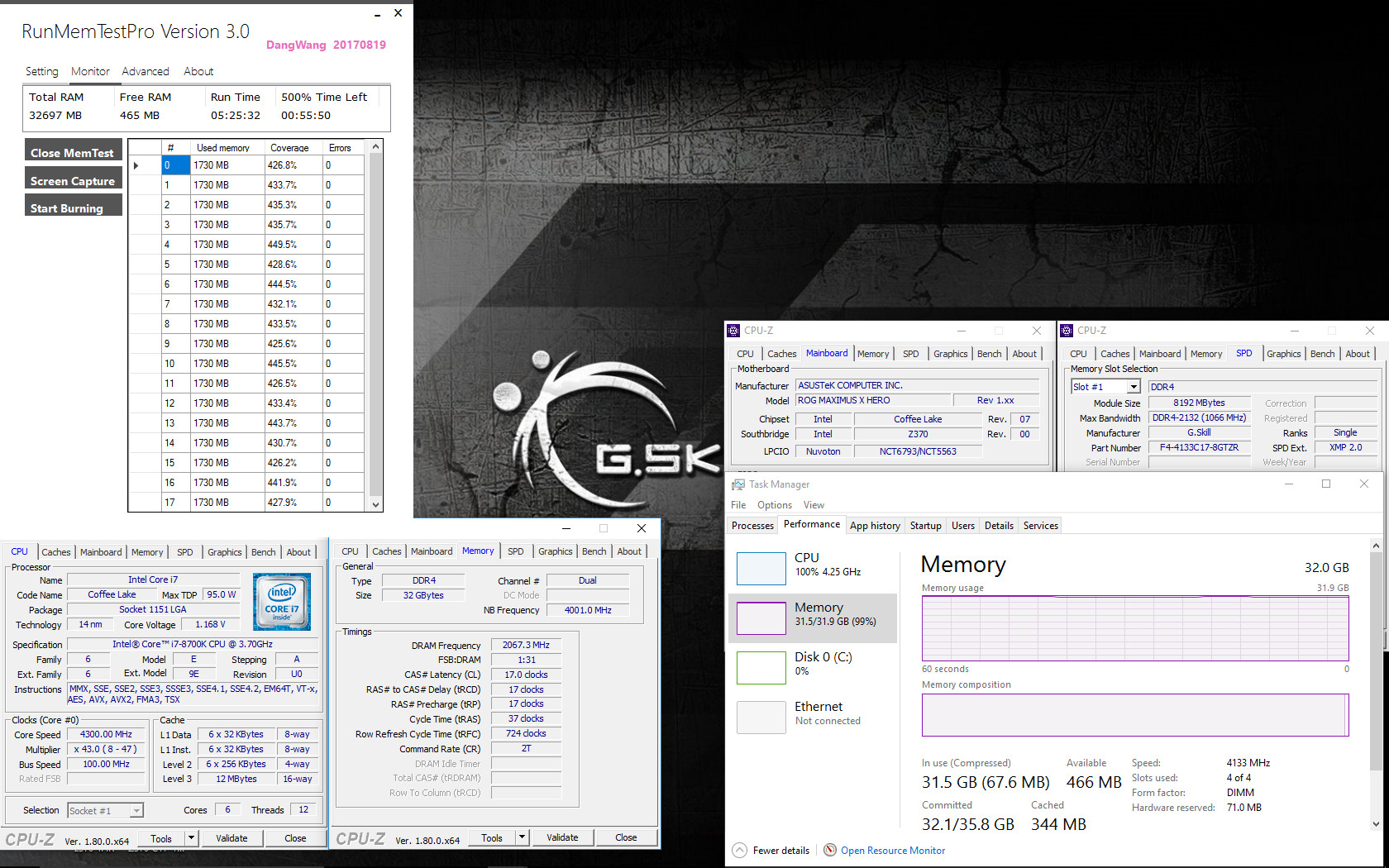 Each of these configurations has been tested with an ASUS ROG MAXIMUS X HERO motherboard and an Intel Core i7-8700K processor, as seen in the screenshots above.