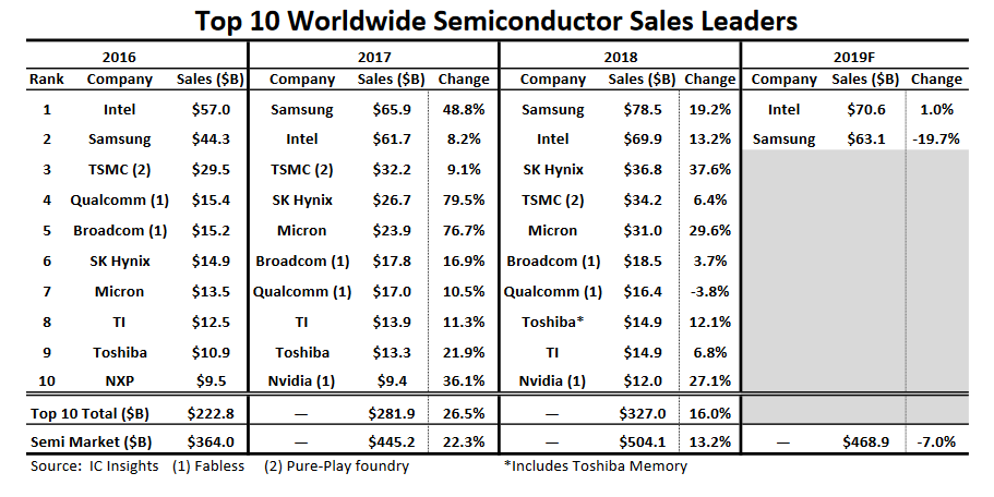 Although IC Insights expects Intel to grow just 1% year-on-year, the firm believes Samsung’s grip will loosen due to a staggering 19.7% decline given that the South Korean supplier is dependent on memory for its chip sales. If the memory market suffers, Samsung suffers much more than its multifaceted competition as a result.