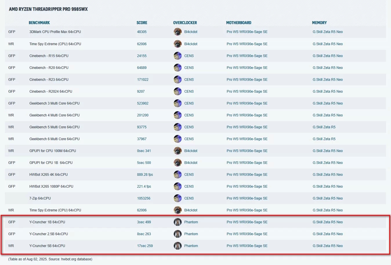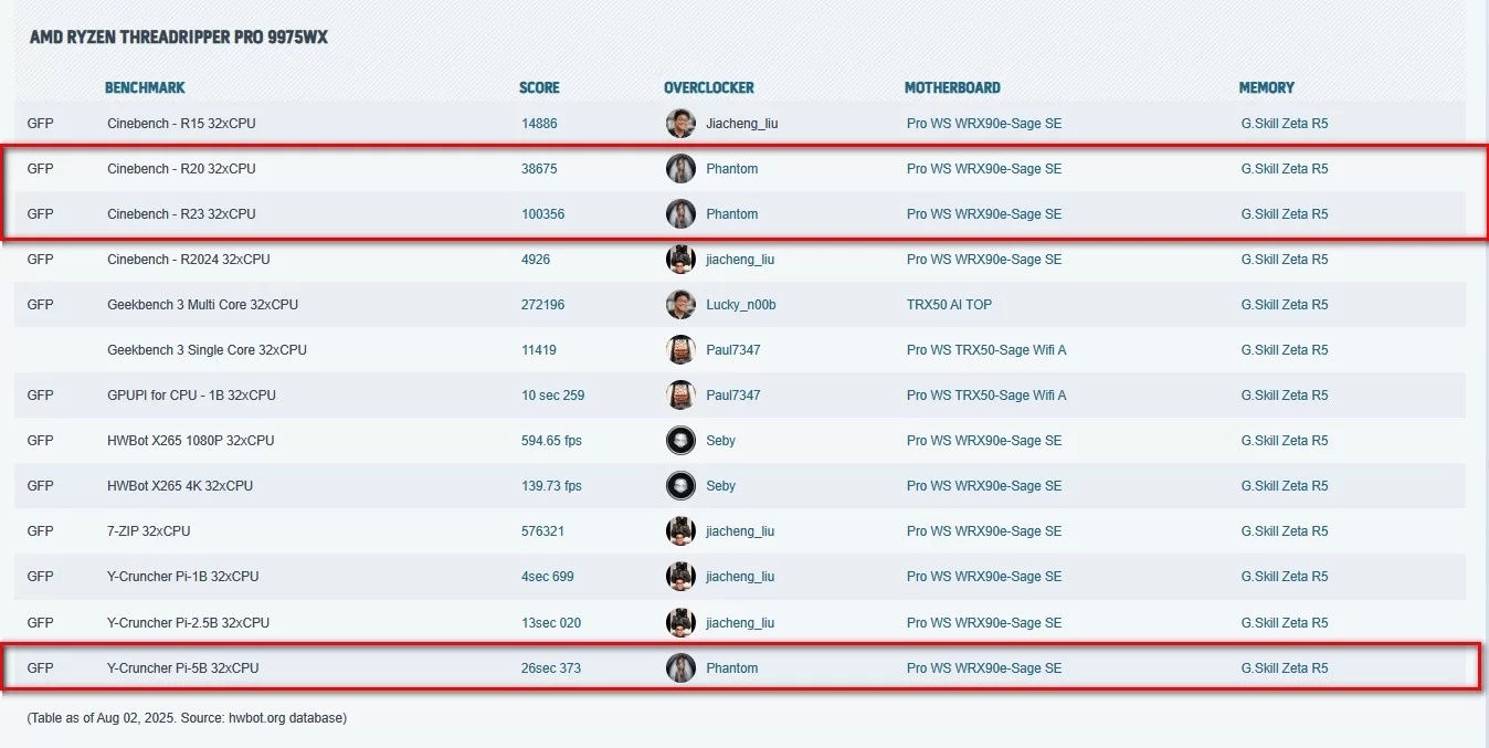 With this memory kit overclocked, Phantom was able to set six new world records during the Asus Threadripper Pro launch overclocking event. Those include new record highs for Y-Cruncher 1B, 2.5B, and 5B (all 64xCPU) using a Ryzen Threadripper Pro 9985WX, and Cinebench R20 and R23 32xCPU and Y-Cruncher Pi-5B 32xCPU records with the Ryzen Threadripper Pro 9975WX. The motherboard was the same Asus Pro WS WRX90E-Sage SE across all entries.