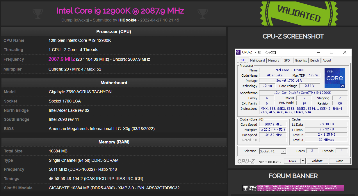 According to HWBot, the new record was achieved by Gigabyte's professional overclocker, “HiCookie”. The overclocker used an Intel Core i9-12900K and a 16GB DDR5-4800 Gigabyte Aorus RGB stick on a Gigabyte Z690 Aorus Tachyon motherboard. For the operating system, HiCookie used Windows XP Professional. As you might've guessed, both the CPU and the memory were cooled using LN2.