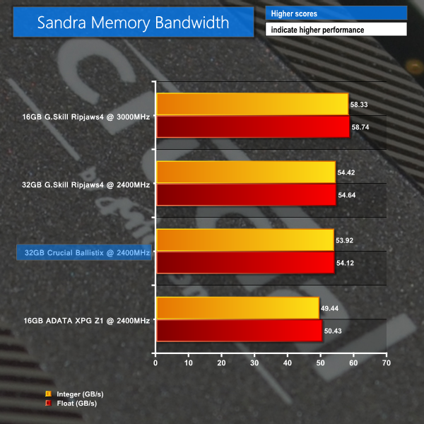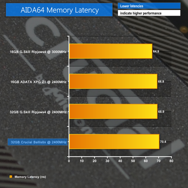 The dual-sided, higher density nature of 8GB DIMMs provides a win for the 32GB Crucial kit over a 16GB 2400MHz competitor in terms of overall memory bandwidth.