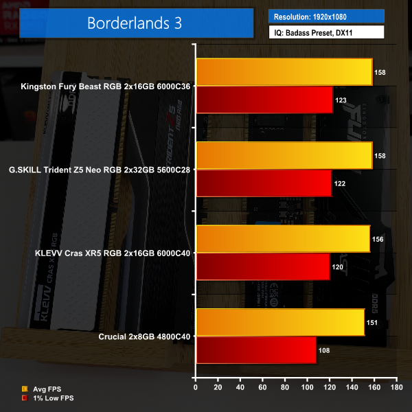 Looking at gaming with Borderlands 3, both the Kingston and G.SKILL sets offer up an average frame rate of 158 FPS. Looser timings versus Kingston’s 32GB set force KLEVV down a couple of FPS on average, and the 1% low number is slightly reduced too. Crucial’s set is well behind. But the money saved on that kit could potentially allow for a graphics card upgrade that will probably buy a much bigger performance improvement.