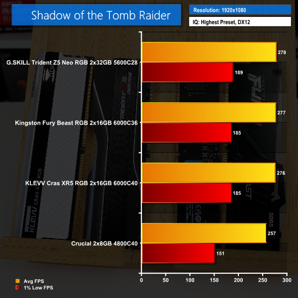 Shadow of the Tomb Raider shows a slightly different trend, because it tends to like higher memory bandwidth and better latency. We have long seen this game do well with dual-rank modules. G.SKILL’s 64GB kit is a little faster than the KLEVV and Kingston 6GHz 32GB sets, which are effectively tied. Crucial is once again a fair bit behind. But at these performance levels, a drop of around 20 FPS average is not an issue.