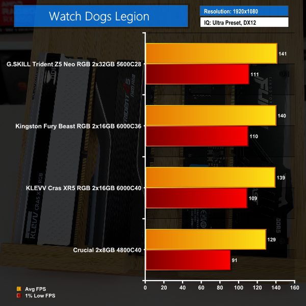 There’s not much performance difference between the top three kits in Watch Dogs Legion; they’ll all serve nicely when coupled with a high-performance graphics card. Once again, the Crucial kit is notably slower. And here, it may actually be a problem to high refresh rate gamers who want triple-digit minimums consistently.