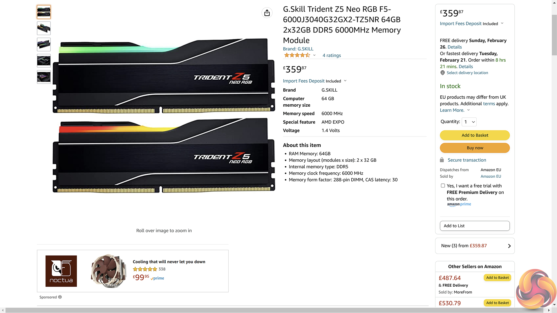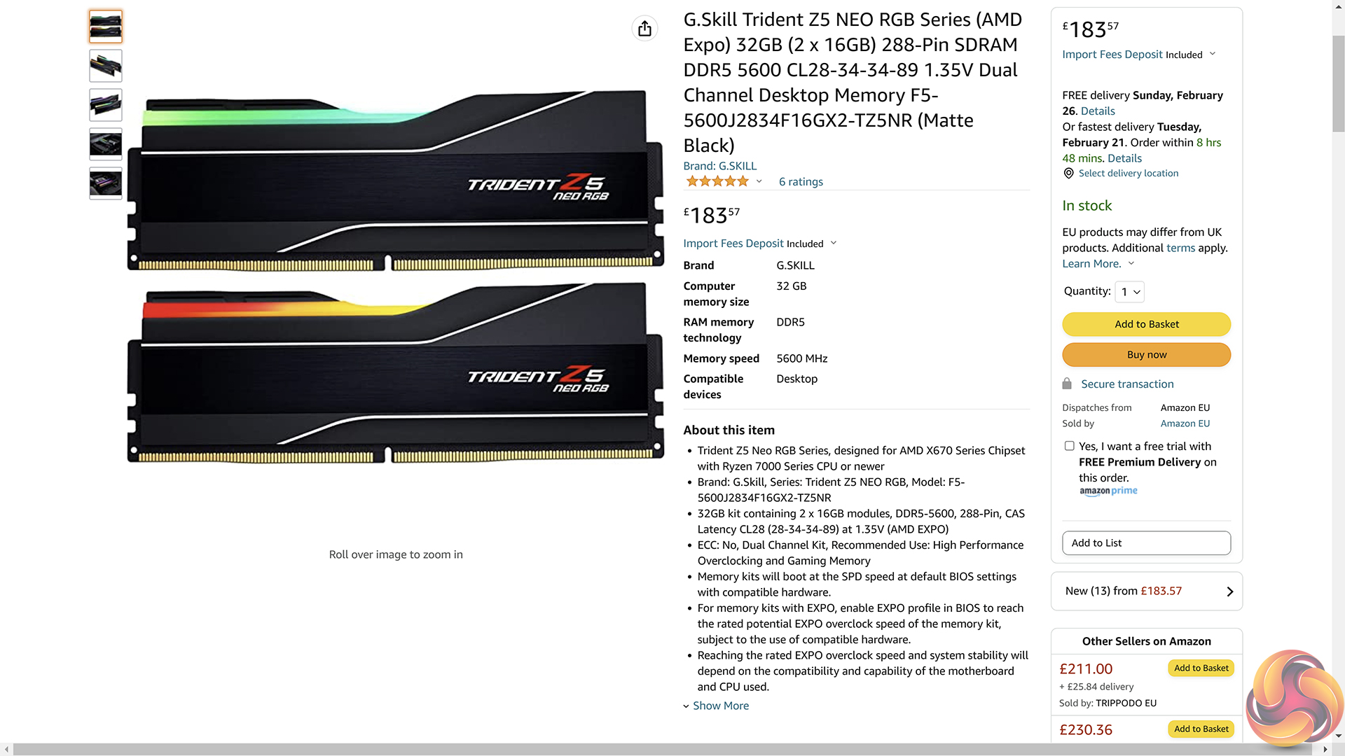 Pricing is difficult to nail down, as is always the case with G.SKILL in the UK. The 6000MHz, slower timings version of this kit is around £360 as an Amazon import. There’s a 5600MHz C30 non-Neo version for £313 as an Amazon import. Or, most importantly, the 2x16GB version of this 2x32GB kit that we are testing is £183 as an Amazon import.