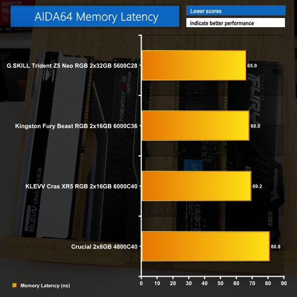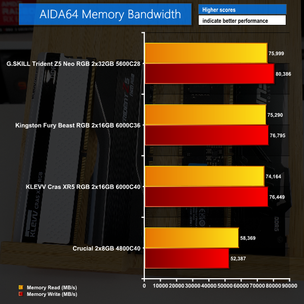 Memory bandwidth numbers favour the G.SKILL kit with its pair of 32GB DIMMs and subsequent greater write speeds. Read performance is pretty similar between the Kingston and G.SKILL options, though, with KLEVV 6GHz CL40 set just a bit behind.