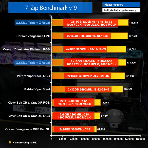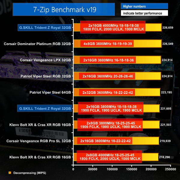 7-Zip compression performance absolutely flies with the dual-rank G.SKILL kit running at 3800MHz C18. Even a reduced CPU memory controller clock, the 4GHz performance is still strong. Focusing on decompression, the 4GHz set enjoys a chart-topping result here, beating out Corsair’s fast 3600MHz kits in our data set.