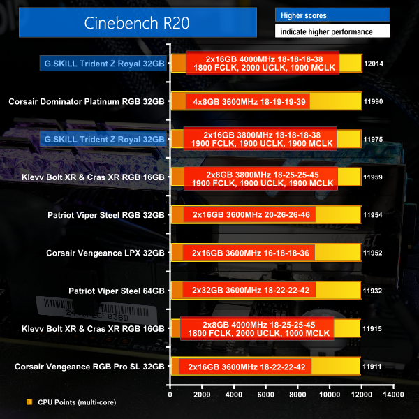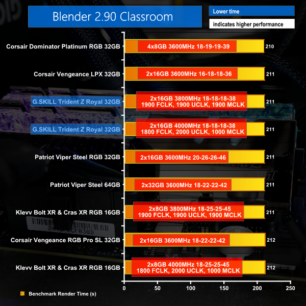 Blender is very CPU heavy and shows basically no performance difference between these high-speed kits of memory. Similar can be said for Cinebench R20 nT, though G.SKILL does manage impressive first and third place finishes.