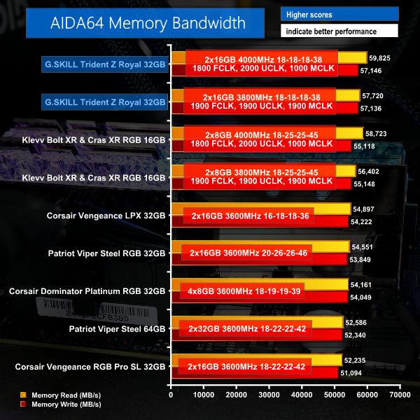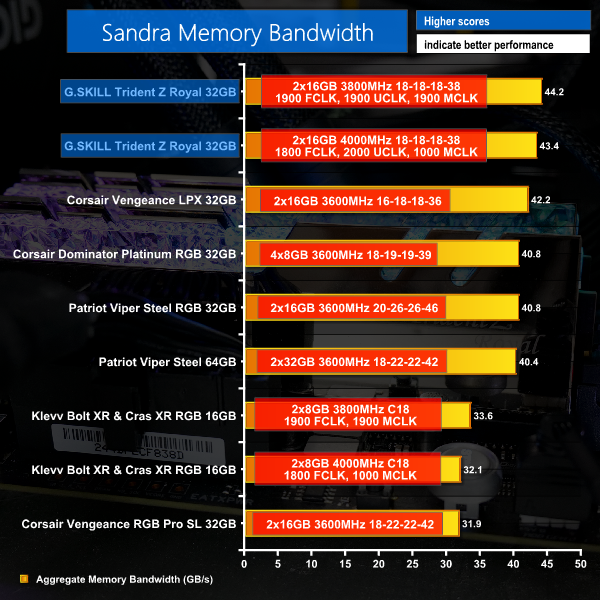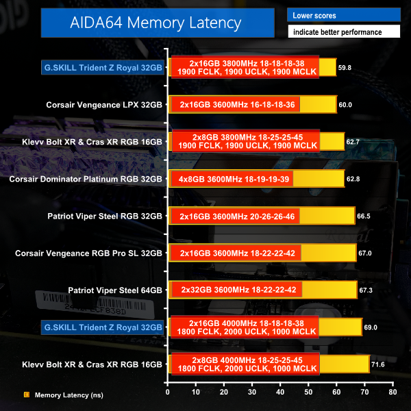 And the latency performance from the 3800MHz C18 test runs is heavily impressive; Corsair’s slick 3600MHz C16 kit is effectively matched at the top of the chart by G.SKILL’s Trident Z Royal.