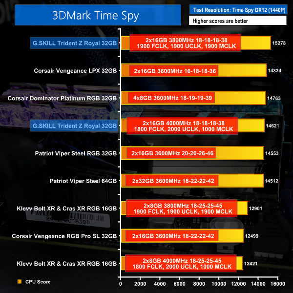 In 3DMark, we once again see a chart-topping showing from the G.SKILL memory running at 3800MHz C18 with the 1.9GHz memory controller clock function.
