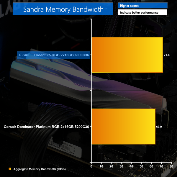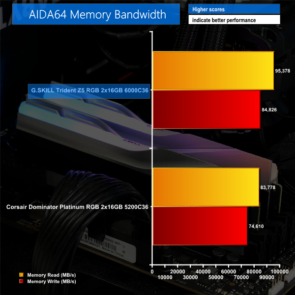 Memory bandwidth numbers are significantly higher on the G.SKILL kit thanks to its 6000MT/s operating speed. This comes as zero surprise, given that these are simply two dual-channel, single-rank kits that differ by their frequency and timings.