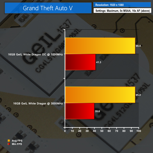 Gaming frame rates also show a small benefit from the higher RAM speed, with the minimums recorded through our GTA V benchmarks increasing by around one-and-a-half FPS, on average. While a 4% boost to minimum frame rates is still relatively small, it can quite comfortably be the difference between meeting the 30, 35 or 40Hz lower refresh rate boundary of a FreeSync or G-Sync monitor.