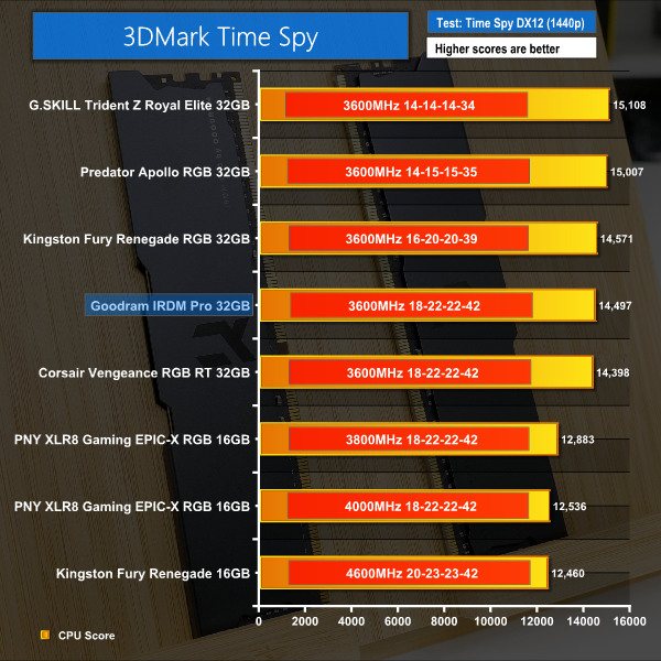 In 3DMark, Goodram once again sits between Corsair and Kingston 3600MHz kits. The dual-rank configuration proves a benefit here over Corsair’s alternative.