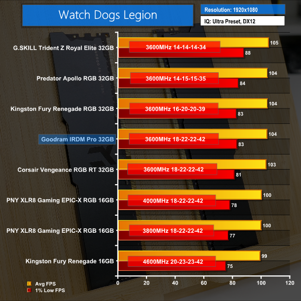 Watch Dogs returns the hierarchy to its general trend, with the 2x16GB Goodram IRDM Pro set sitting a little above Corsair’s performance and roughly matching the tighter Kingston sticks.