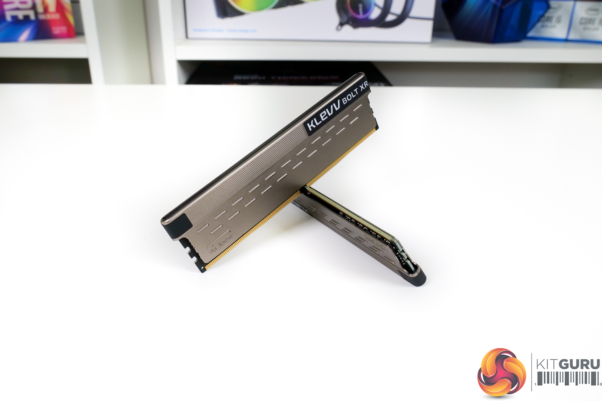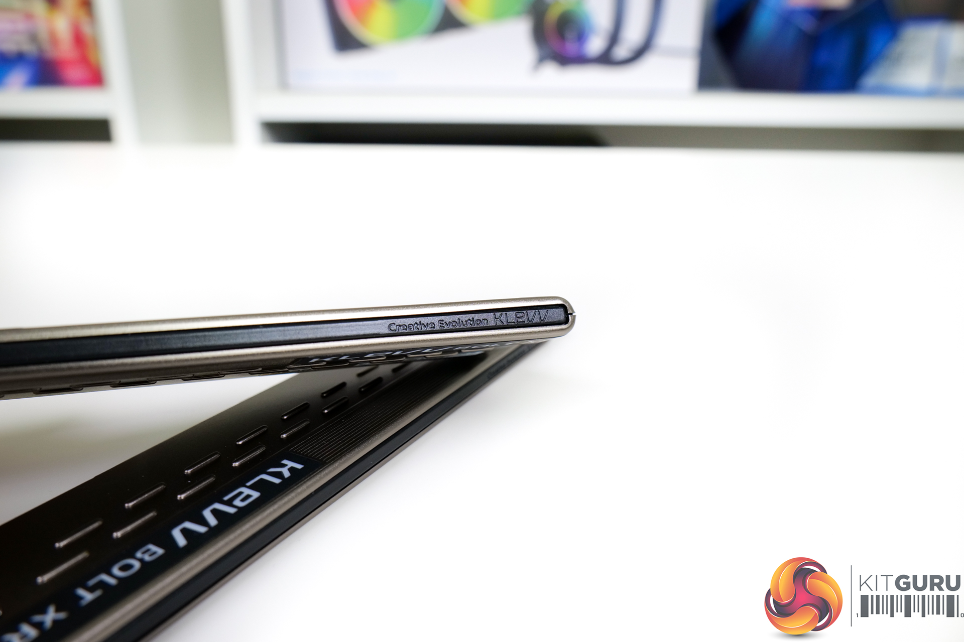 Starting out with Bolt XR modules, KLEVV uses an aluminium heatspreader that is primarily gunmetal-type grey in colour. That sits atop the black PCB. The modules have some physical design tweaks to add a touch of visual flair; these come in the form of notches and grooves which simply adjust the sheet of aluminium away from being a basic flat plate.