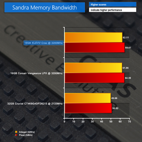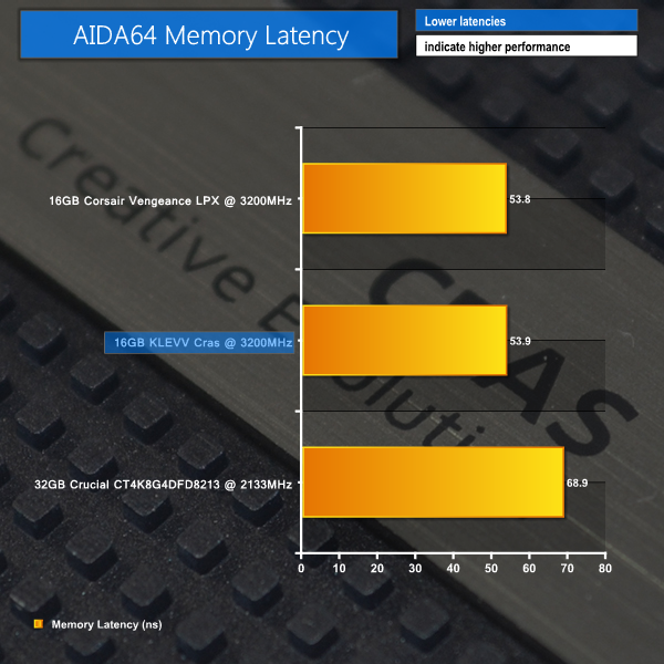 KLEVV's 3200MHz Cras memory shows almost identical performance to that of Corsair's 3200MHz Vengeance LPX modules. That doesn't really come as a surprise seeing as both kits use identical operating frequencies, timings, and capacities. It would come as no surprise if Corsair was, in fact, using SK Hynix memory IC's for its modules.