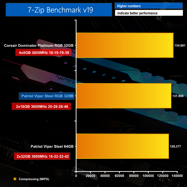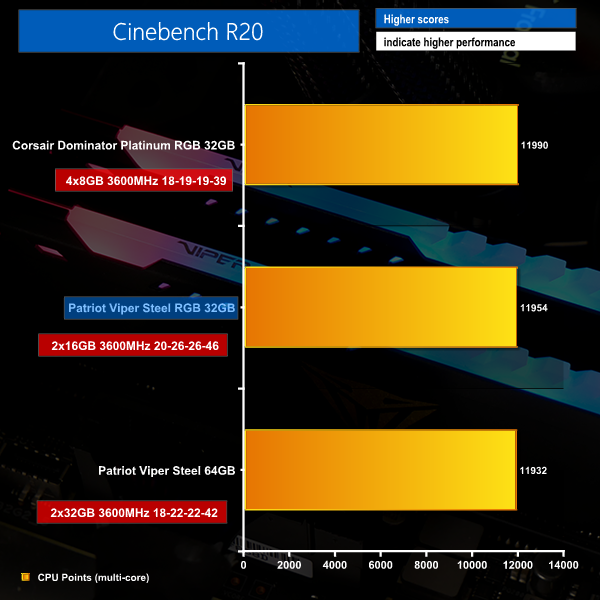 In Cinebench, we again see the SK Hynix-based Viper Steel RGB modules slightly outperforming the higher-capacity, SpecTek-based non-RGB kit. Corsair’s tighter Micron kit is again at the top of the chart by a narrow margin, though.