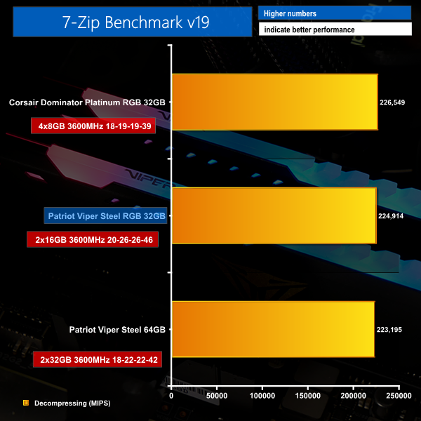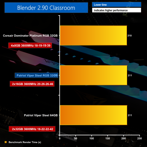We see a reasonable start for the Viper Steel RGB memory kit in 7-Zip. Middle-of-the-pack scores are registered both in terms of compressing and decompressing. Blender, however, shows very little variance between each tested kit. The Patriot Viper Steel modules cannot quite match the performance of Corsair’s expensive Micron E-die kit, but the differences are minor.