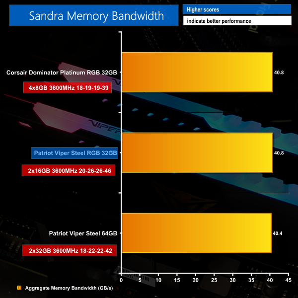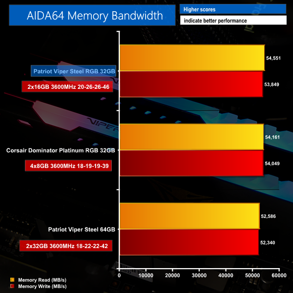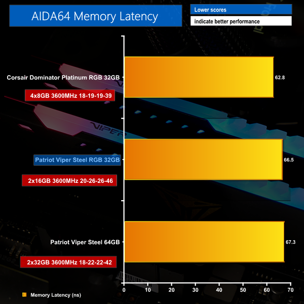 Synthetic memory bandwidth tests show very little difference between Patriot’s Viper Steel RGB modules and the premium Corsair Dominator Platinum options in our testing. The SpecTek-based Viper Steel 64GB kit is again a little slower than the SK Hynix-based RGB version though, despite having tighter rated timings and a higher kit capacity.