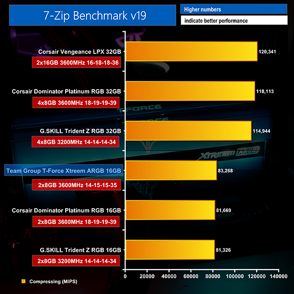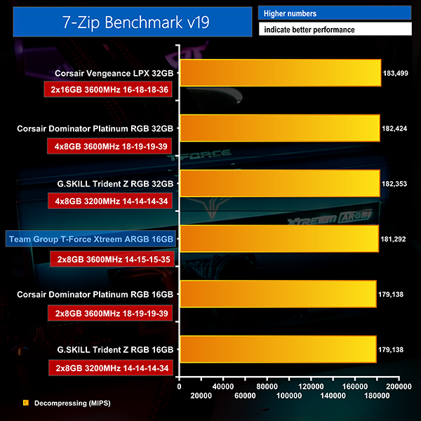 Starting with 7-Zip compression, we see the low latency Team Group kit offering up good performance for a 16GB set. The Xtreem ARGB operating specifications make it a little faster than Corsair’s competing Dominator modules, but the extra memory ICs of the higher-capacity kits win out in this test.