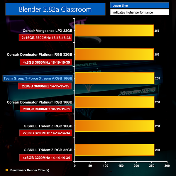 Blender shows minimal performance gain from tight 3600MHz memory, as proven by Team Group’s equal performance versus alternative 16GB kits.