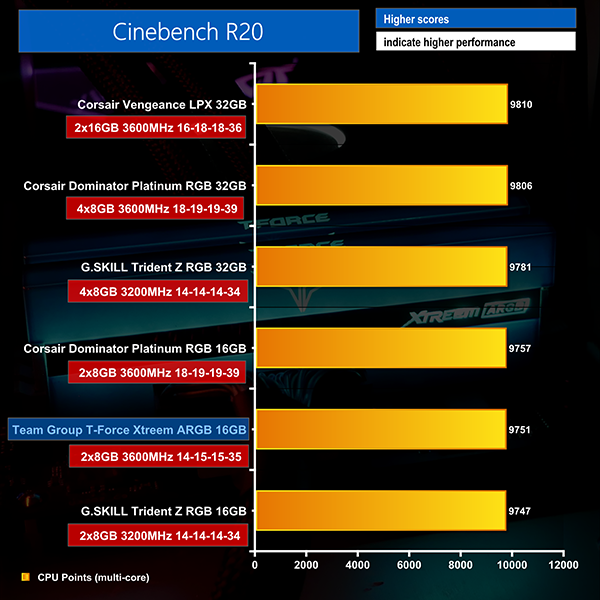 There is also little difference in performance when looking at Cinebench results. Here, the Team Group kit is practically equivalent to the performance of the competing 16GB kits, implying that tighter timings are of minor benefit in this test.