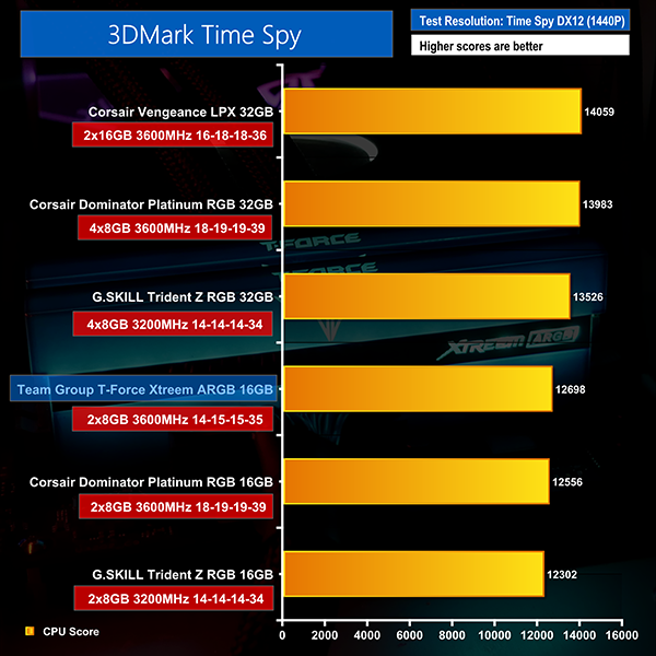 Again, we see the Team Group and its tight timings deliver solid performance and this time in 3DMark. The 3600 C14 kit’s numbers are slightly better than those offered up by our 16GB competitor but cannot match the performance from the more expensive dual rank 32GB options.