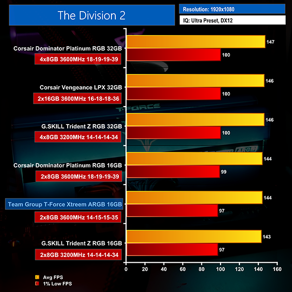 The performance hierarchy remains consistent in The Division 2, with the higher density 32GB kits taking up chart-topping positions. This time, however, Corsair’s 3600MHz C18 Micron E-Die-based modules offer a slight performance bump over the tighter Samsung B-Die Team Group kit.