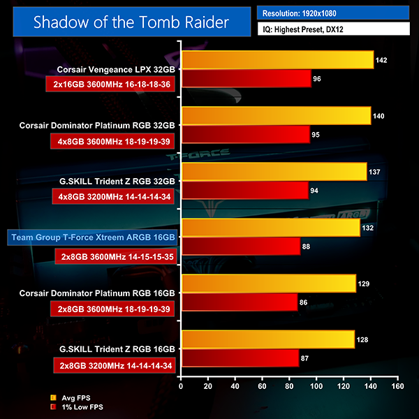 Shadow of the Tomb Raider consistently proves to be sensitive to memory settings, and this allows the Team Group Xtreem ARGB kit to offer stellar performance. Here, the 3600MHz C14 kit is a handful of FPS faster than the competing, slower 16GB solutions. The higher capacity kits are faster, but they are also more expensive.