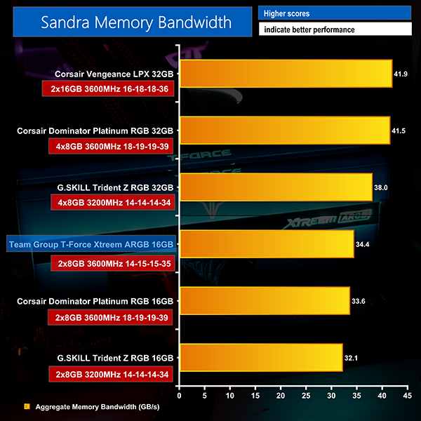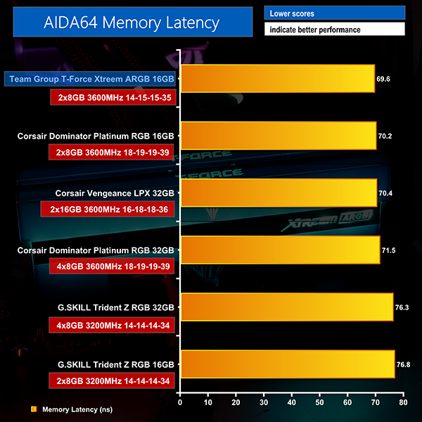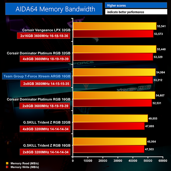 AIDA’s memory bandwidth test is a little more frequency biased, hence the Team Group kit shows minor outperformance versus Corsair’s Dominator competitor with looser timings.
