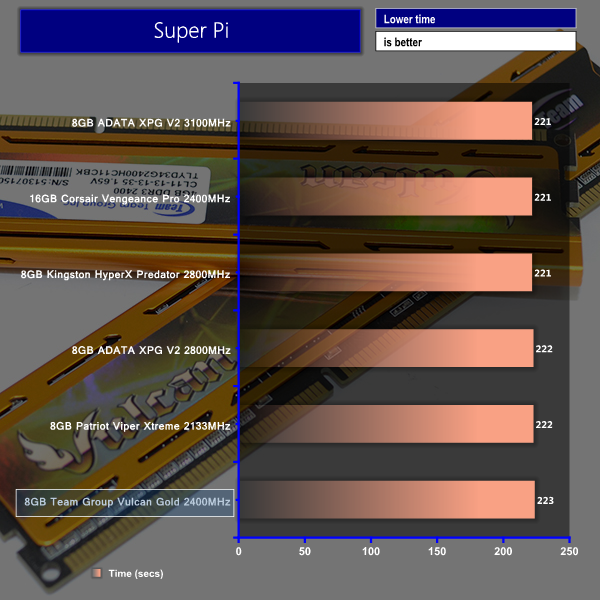 Super Pi gave the Team Group memory kit a one second deficit against the comparison products in our chart. Super Pi is known for reacting to memory frequency and timings, so the mixture of increased latency or reduced speeds, in comparison to other kits, may be to blame for the Vulcan kit's one second deficit.