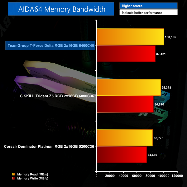 Memory bandwidth scores very favourably on the TeamGroup kit thanks to the lofty 6400MHz operating frequency. The performance bump versus even G.SKILL’s 6GHz kit is sizable.