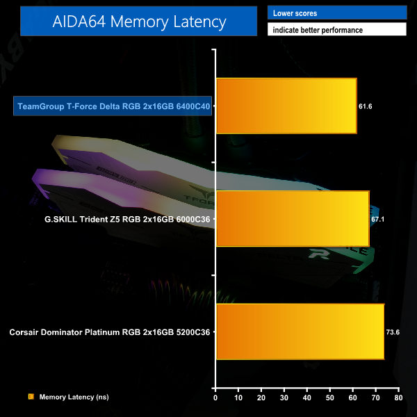 There isn’t too much latency penalty from the CL40 timings, either. This is because the 6400MHz operating frequency looks to be making up for the slacker timings versus the competing sets.